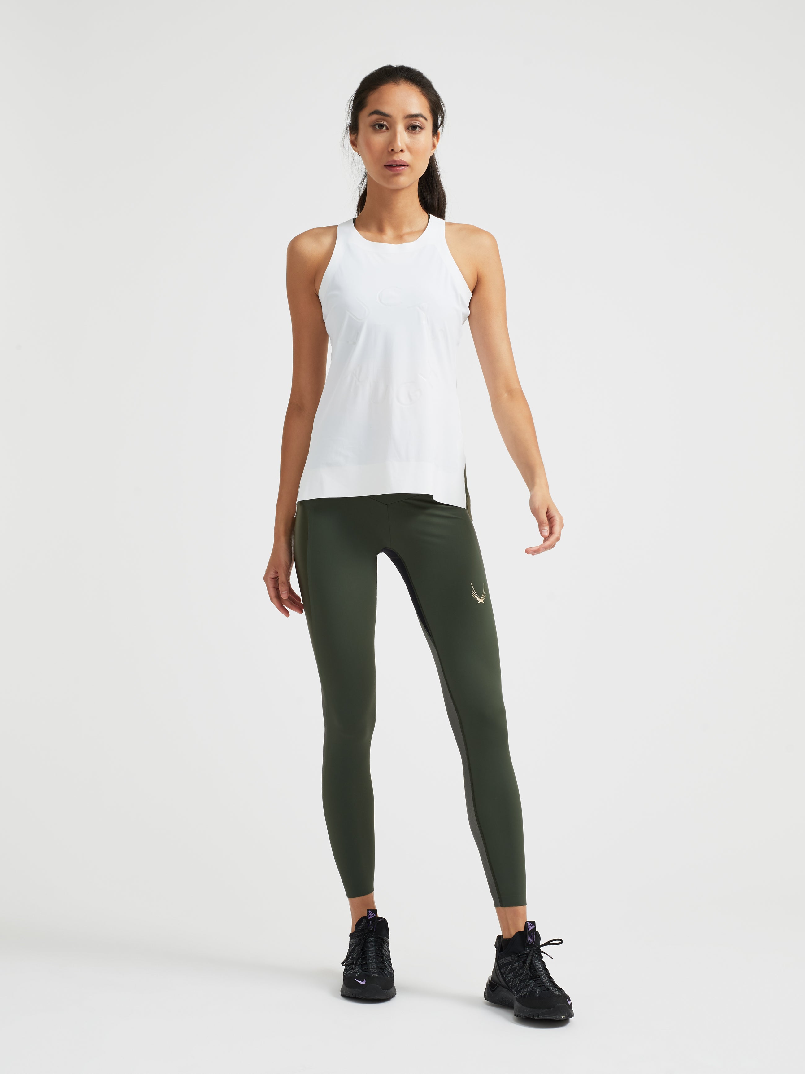 This signature full-length performance legging is crafted from compressive fabric and finished with bonded seams and hem. The Axis leggings are inspired by the bound detailing of boxing wrap and feature contrasting matte and gloss lines that complement the compressive nature of the performance fabric. The high-rise bonded Svelte waistband features wrap paneling and reflective chevron details for visibility on your next run.