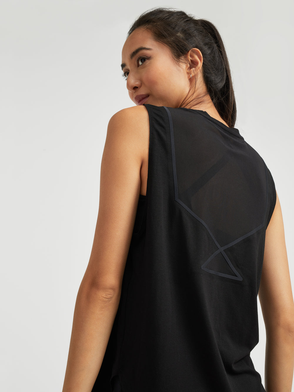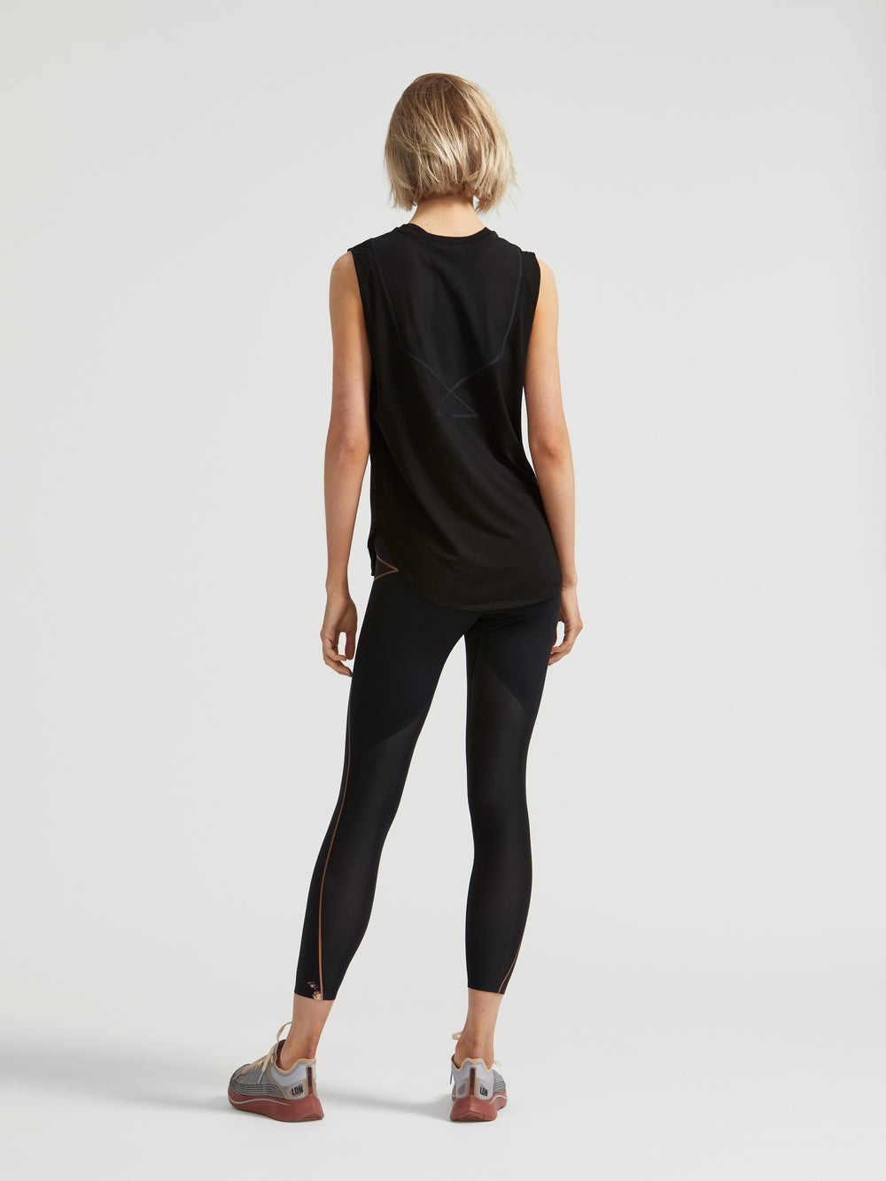 Now available in black, a new relaxed tank shape in soft touch fabric and designed for a loose fit. The Kubrick Tank's lightweight feel creates a delicate drape that flatters the body. At the back, technical taping frames the breathable mesh panelling.
