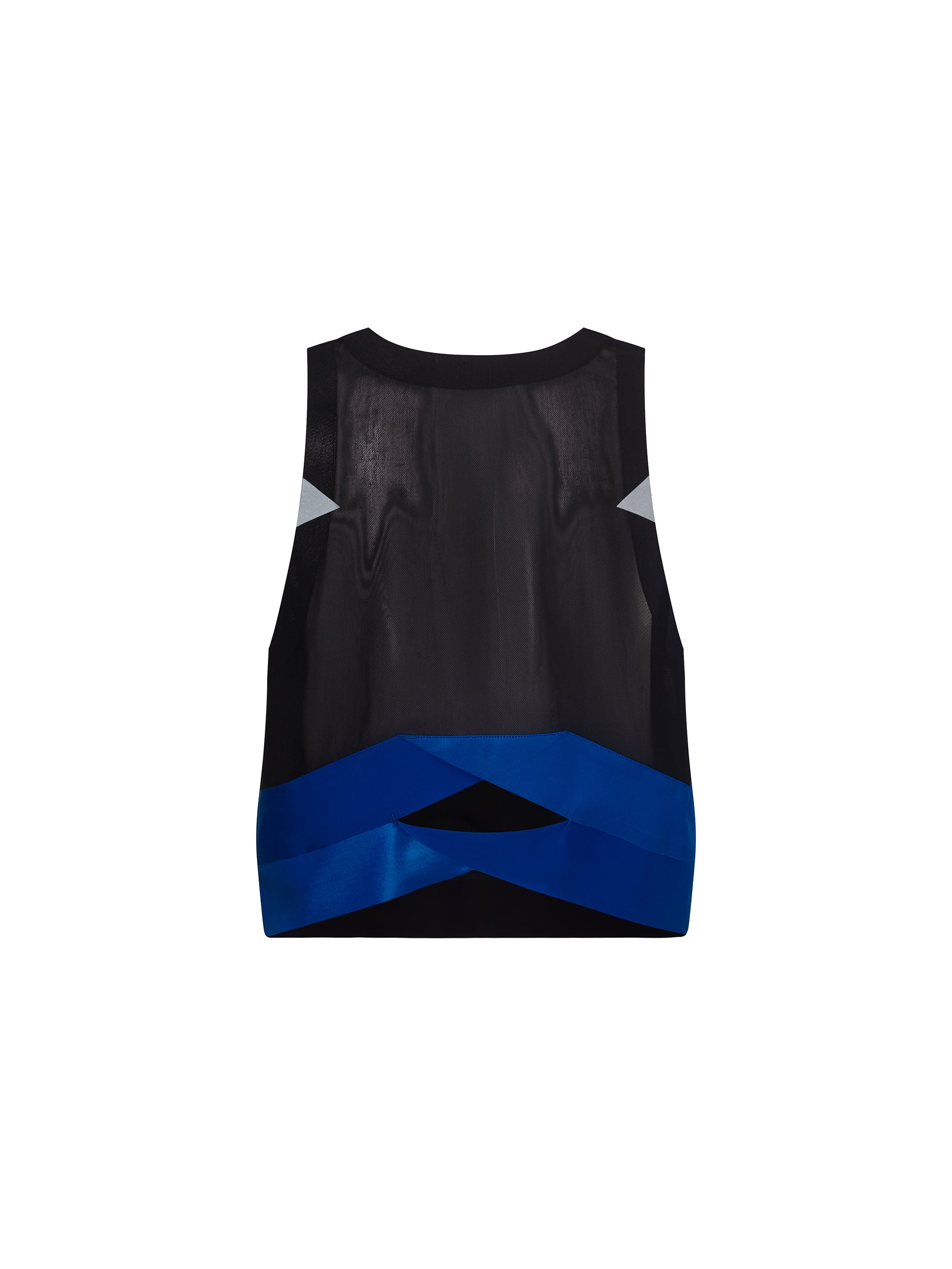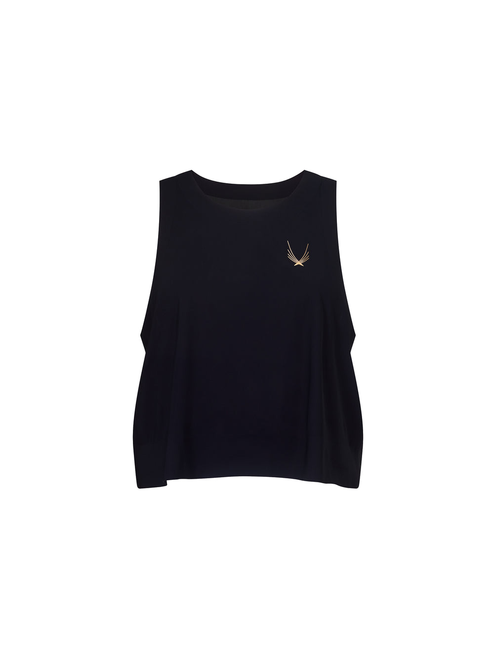 Loose fitting sports tank designed as a layering style made with breathable and quick drying fabric. A new take on the classic black tank. Designed with tonal back twisting boxing wrap inspired panels and mesh to subtly highlight your sports bra while adding ventilation. Reflective triangles are placed at the back for visibility.